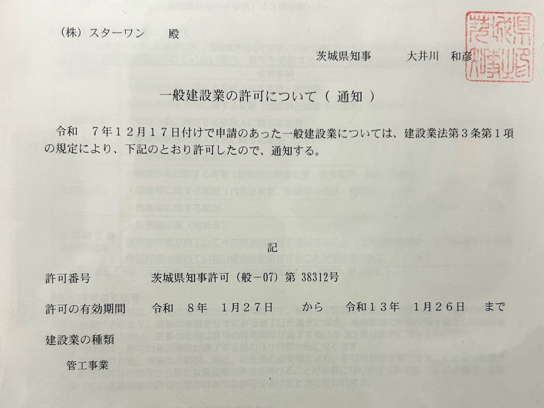 建設業許可「管工事業」を取得しました